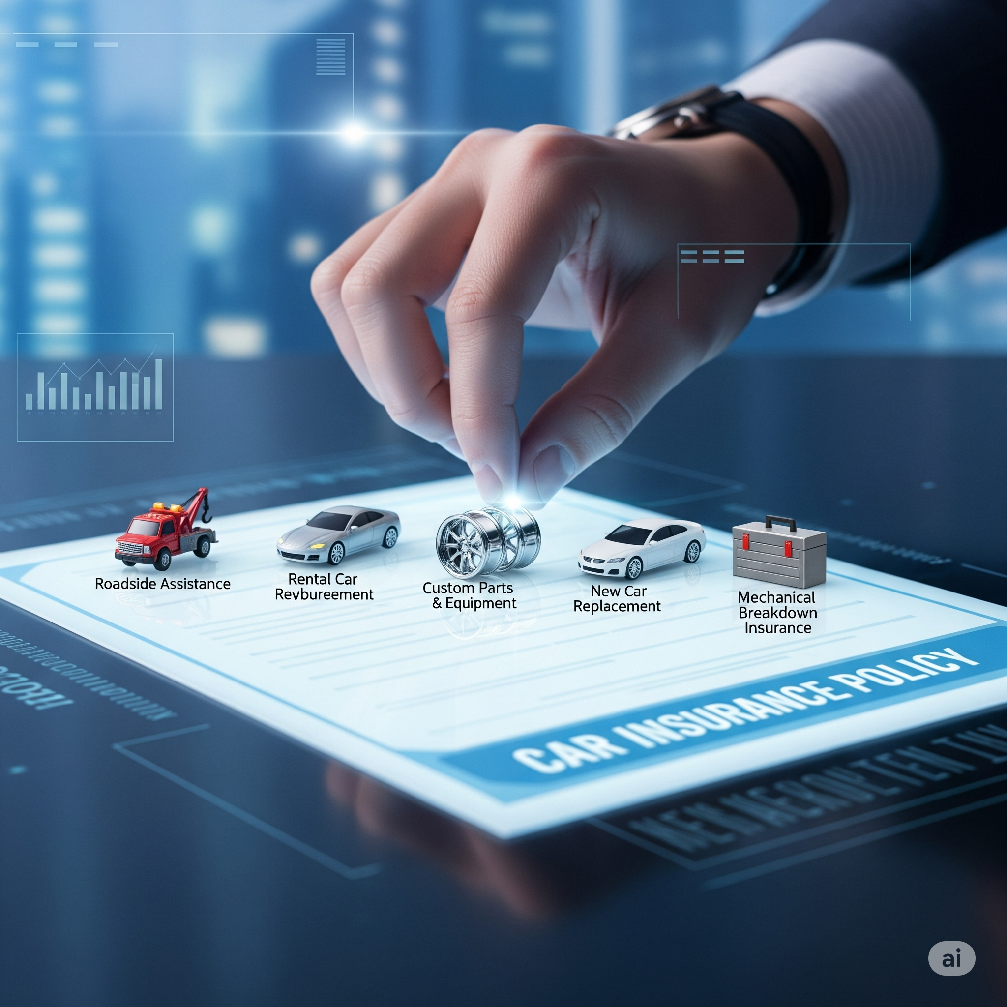 - Roadside Assistance/Towing This option provides help in the event that your vehicle is damaged. It typically includes towing services towards the closest repair service battery jump starts and tire replacements for flats and fuel delivery in the event that youre running out of fuel or need lockout service. This is cost effective and convenient supplement to your automobile insurance policy.